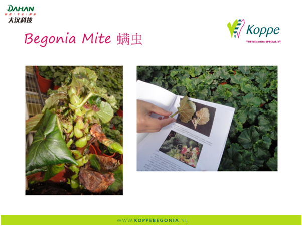 丽格海棠主要受两种螨虫危害:茶跗线螨和食酪螨属,通常螨虫透明微小很难被发现,所以不易观察到螨虫虫体,栽培时要特别注意温室高温干燥时容易发生的气候环境。
