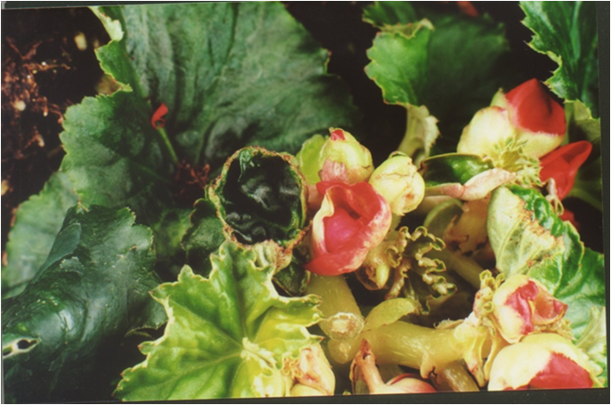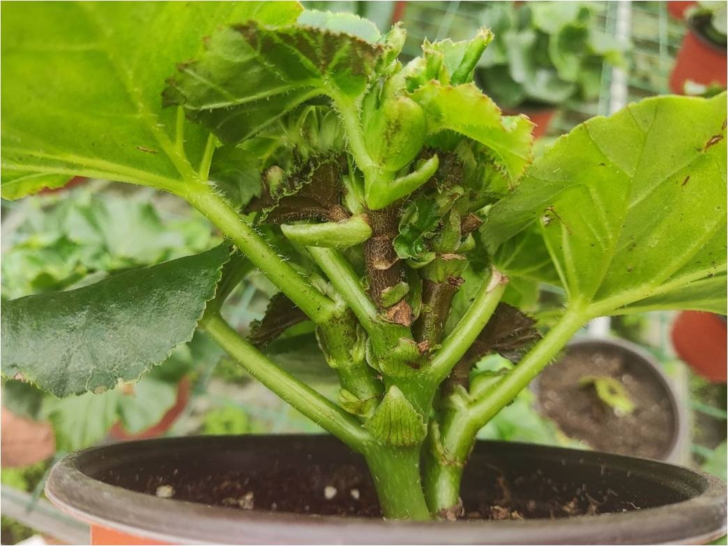 其危害特征容易跟丽格海棠生长点畸形(DGPB、MGB)和镰刀菌的危害特征混淆。如下图所示: